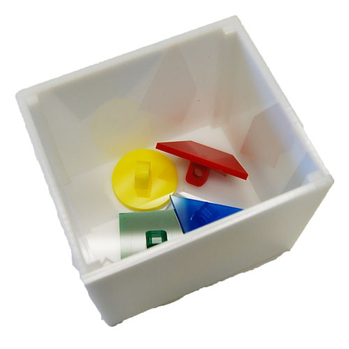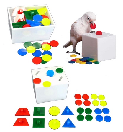 LEVEL 1: «TO LEARN, HOW TO LEARN» • Initiation of the training method Initiation of training All parrots love to insert objects inside other objects. It is a natural game for them. The goal here is to teach them to do it on command. The Teach Box is rewarding for the bird because it is easy to do. The Teach Box includes discs and coins. As you will notice, the game presents openings on top and has no bottom. The Teach Box is, in fact, two games in one. The Teach Box is a game of initiation and training. With this game, the bird “learns how to learn” and gives you the opportunity to initiate with him the ritual of the “training session” (see preparation). The bird will expect to learn and play each time you install him on the training table.
