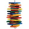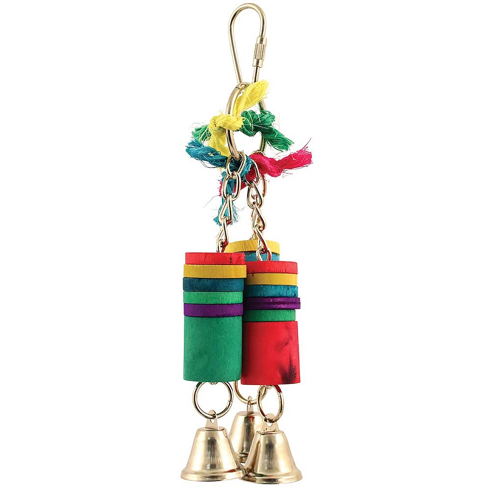 The bright colours of the wood intrigue an inquisitive Parrot. As the Parrot explores their Chew & Chime Parrot Toy three shiny bells chime along happily, making sounds noiseloving Parrots appreciate.