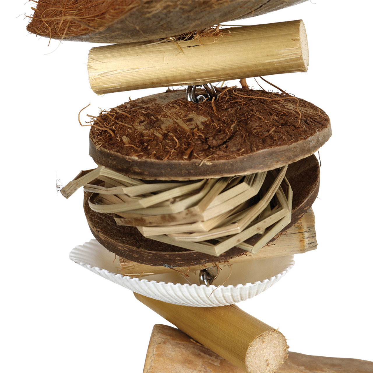 Plus, there is an assortment of materials to keep your feathered friend busy, including soft wood, seashells and coconut shell for chewing on. Plus, woven grass hoops and coconut husk fibres to pick at, unravel and preen on.