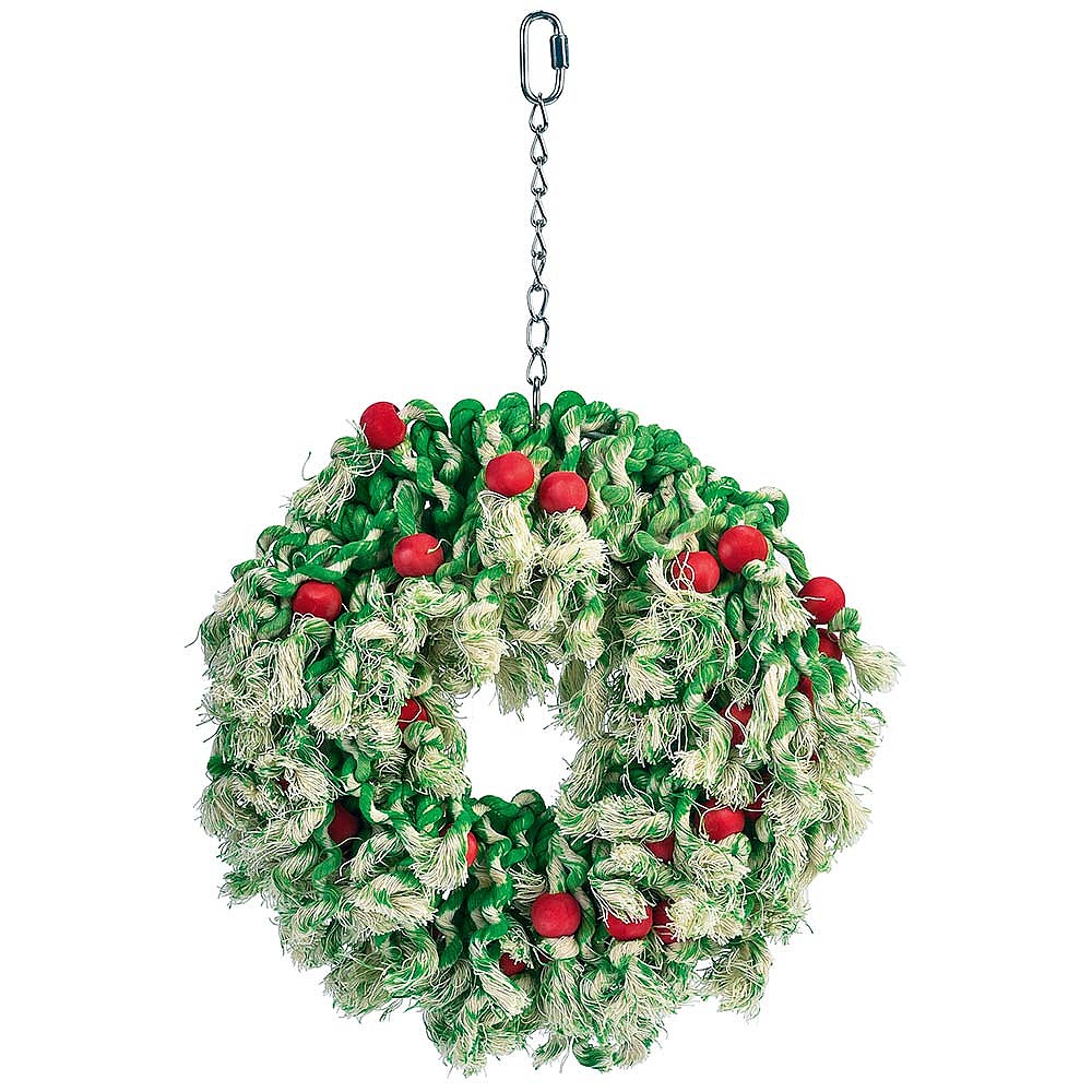 The seasonal coloured cotton rope on designed to keep birds entertained over the busy holiday period. Knotted on are red wood bead ‘berries’ for the bird to chew and try to remove.