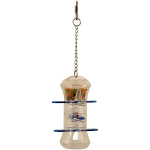 The clear design allows the bird to easily see their reward and the challenge ahead. Unscrew the top of the Push and Pull Parrot Toy and fill the top section with food and treats. Now screw the lid back on and hang in the Parrot’s cage using the stainless steel chain and quick link.