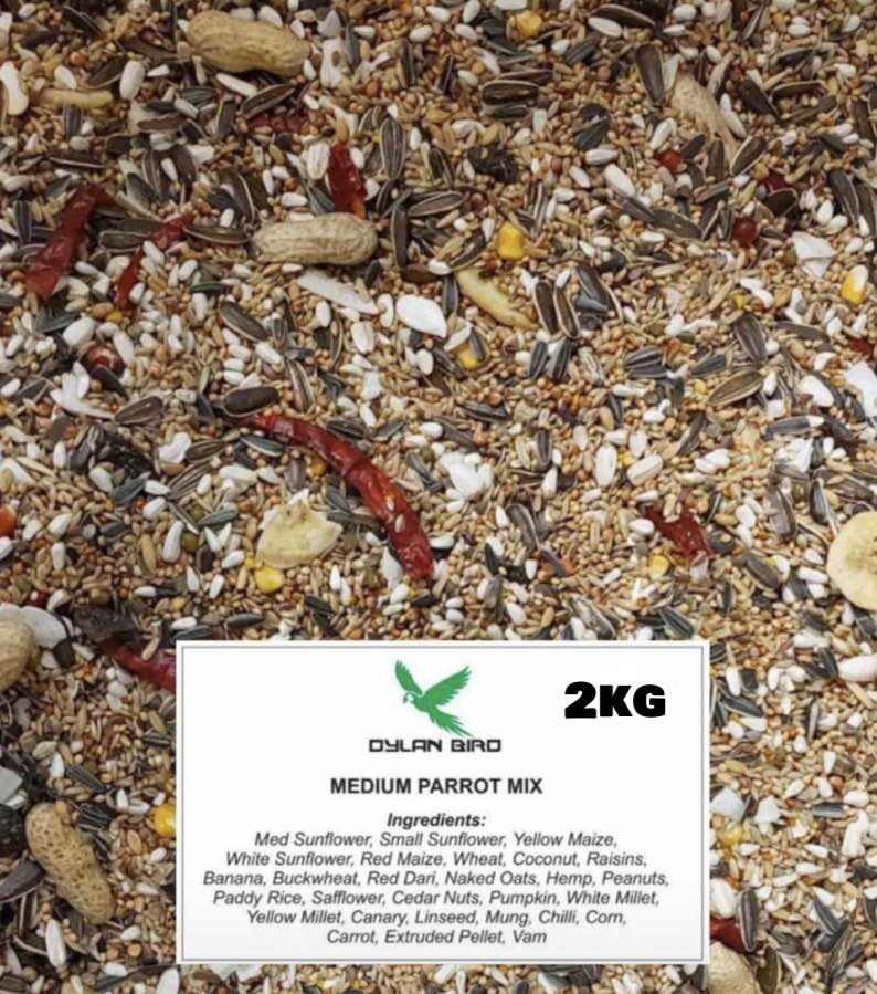 Dylan Bird Medium Parrot Mix is a complete food formulated for cockatiels, parakeets and small parrot species. A Mix of high grade seeds, fruit, nuts & vam, rich in digestible proteins and oils, designed to provide all the essential vitamins, minerals and trace elements required to keep your birds in optimum health and condition, that can be supplemented with extra nuts as well as fresh fruit and vegetables.