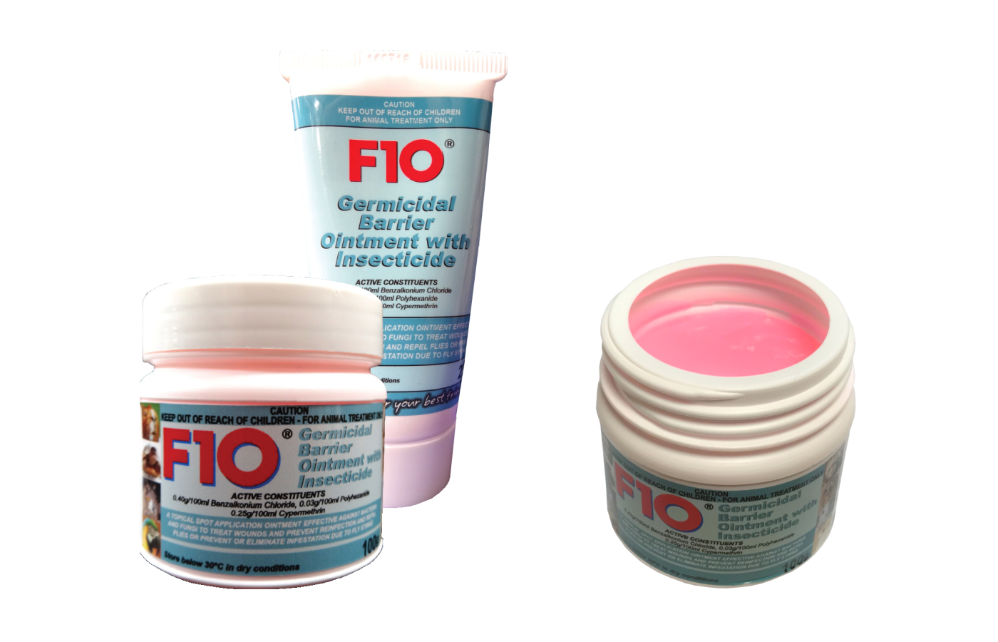 The F10 Germicidal Barrier Ointment with Insecticide is available in 25g tubes and 100g tubs.