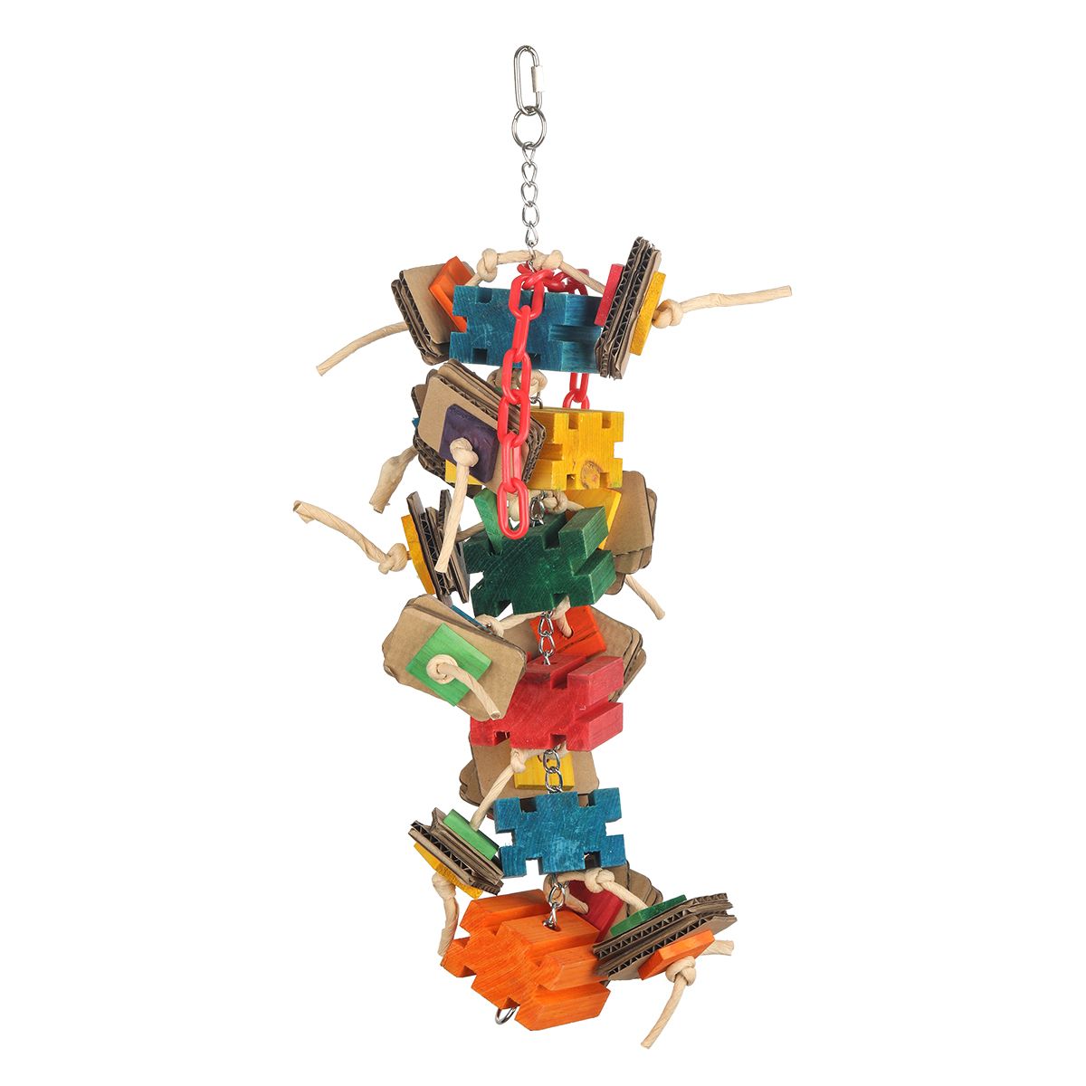 All your birds favourites in one giant toy. With the ever popular wooden groovy blocks, cardboard slices, wooden slats, paper rope and plastic chain. Chewing heaven for all medium and large parrots