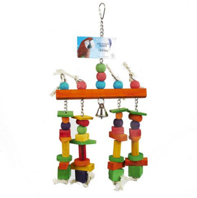 With wooden blocks and beads, central wooden block, hanging bell and cotton rope.