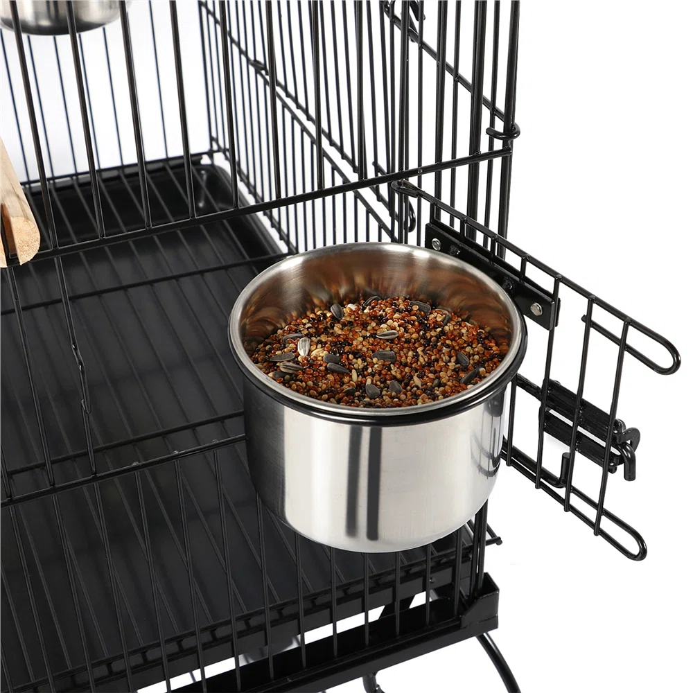 • Thoughtful designs: The extra storage shelf on the stand can hold your pets’ accessories and feed, keeping them handy and neat. Thanks to the 2 feeder doors, feeders are accessible without opening the main door so that you can remove the feeders and replenish the feed from the outside and don’t need to risk your bird escaping. 2 Free stainless steel feeders are included.