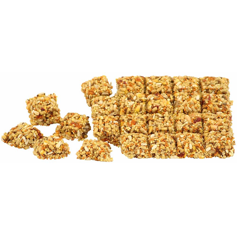 Corn, Red Millet, Hulled Canary Grass Seed, Hulled White Millet, Malto-Dextrin, Soybean Meal, Safflower, Wheat Flour, Sugar, Acacia Gum, Glycerin, Corn Syrup, Papaya, Cranberries, Corn Oil, Ground Limestone, Dicalcium Phosphate, Whole Powdered Egg, Canola Oil, Dates, Pineapple, Mango, Peanuts, Hydrolyzed Soy Protein, Iodized Salt, Citric Acid, Choline Chloride, Carrageenan, Dl-Methionine, Mixed Tocopherols, Vitamin E Supplement, Manganese Oxide, Ascorbic Acid, Niacin Supplement, Zinc Oxide, Manganese Proteinate, Zinc Proteinate, Carotene, D-Calcium Pantothenate, Biotin, Riboflavin Supplement, Sodium Selenite, Cupric Sulfate, Copper Proteinate, Pyridoxine Hydrochloride, Vitamin A Acetate, Thiamine Mononitrate, Copper Proteinate, Vitamin B12 Supplement, Vitamin D3 Supplement, Folic Acid