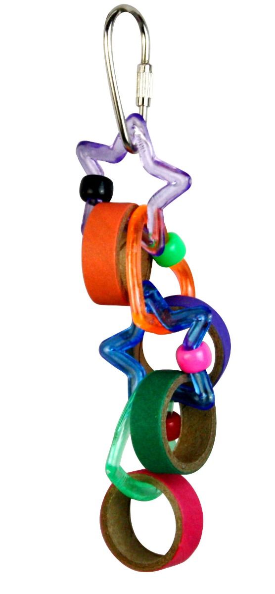 Chewable fruit flavoured bagels with tough plastic hearts and star shapes and beads.