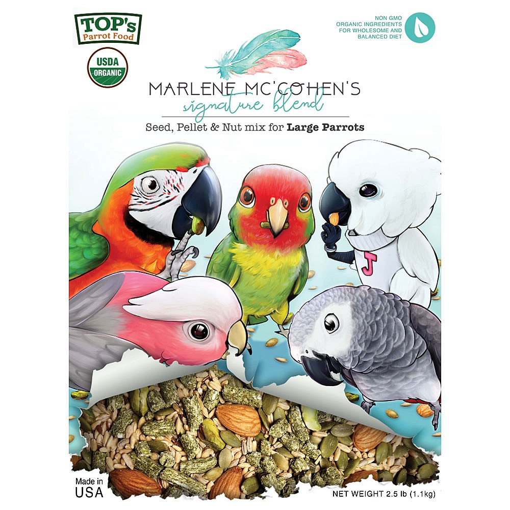 “My passion for birds began when I was 7 years old with my first bird, a Cockatiel named Doolie. Since then, I have dedicated my life to loving, rescuing and caring for Parrots. That’s why I am excited to work with TOP’s Parrot Food to bring you Marlene Mc’Cohen’s Signature Blend, a USDA Organic Certified mix of non-GMO ingredients to supply your companion with the nutrients they need to live a happier and healthier life. Remember to also feed your birds fruits and vegetables daily.”