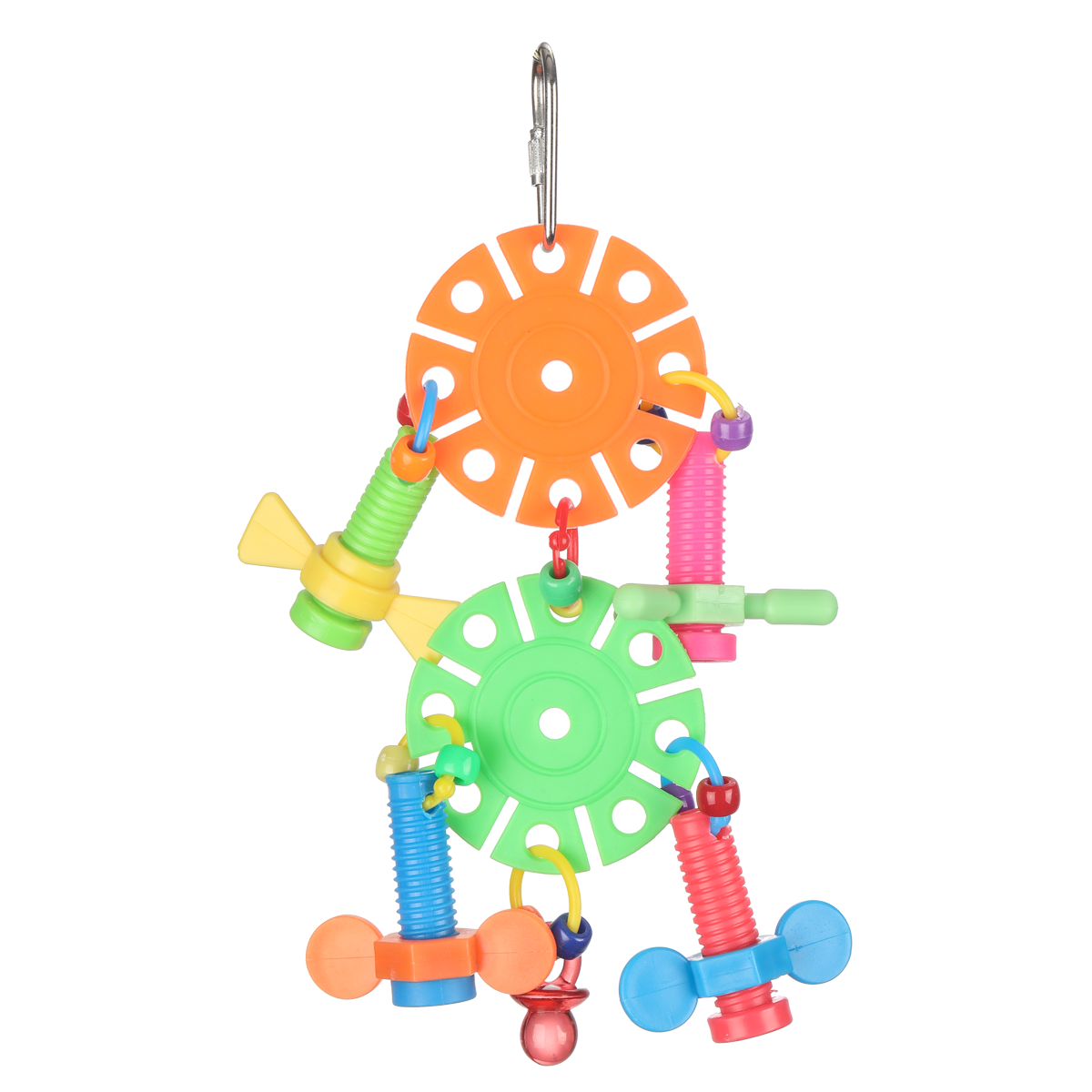 2 Plastic cogs hold these fun nuts and bolts which birds love the feel of as they unfasten them. With binkies and pony beads as added extras!