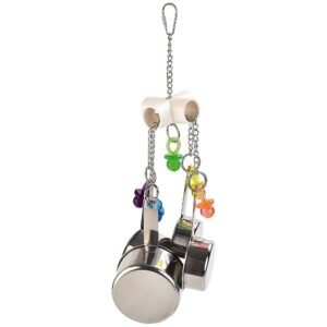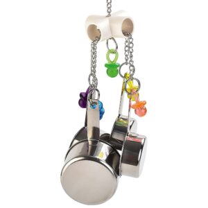 This Pan Clacker Parrot Toy glistens and shines as the four stainless steel pans move around on their chains, making lots of fun sounds as they do.