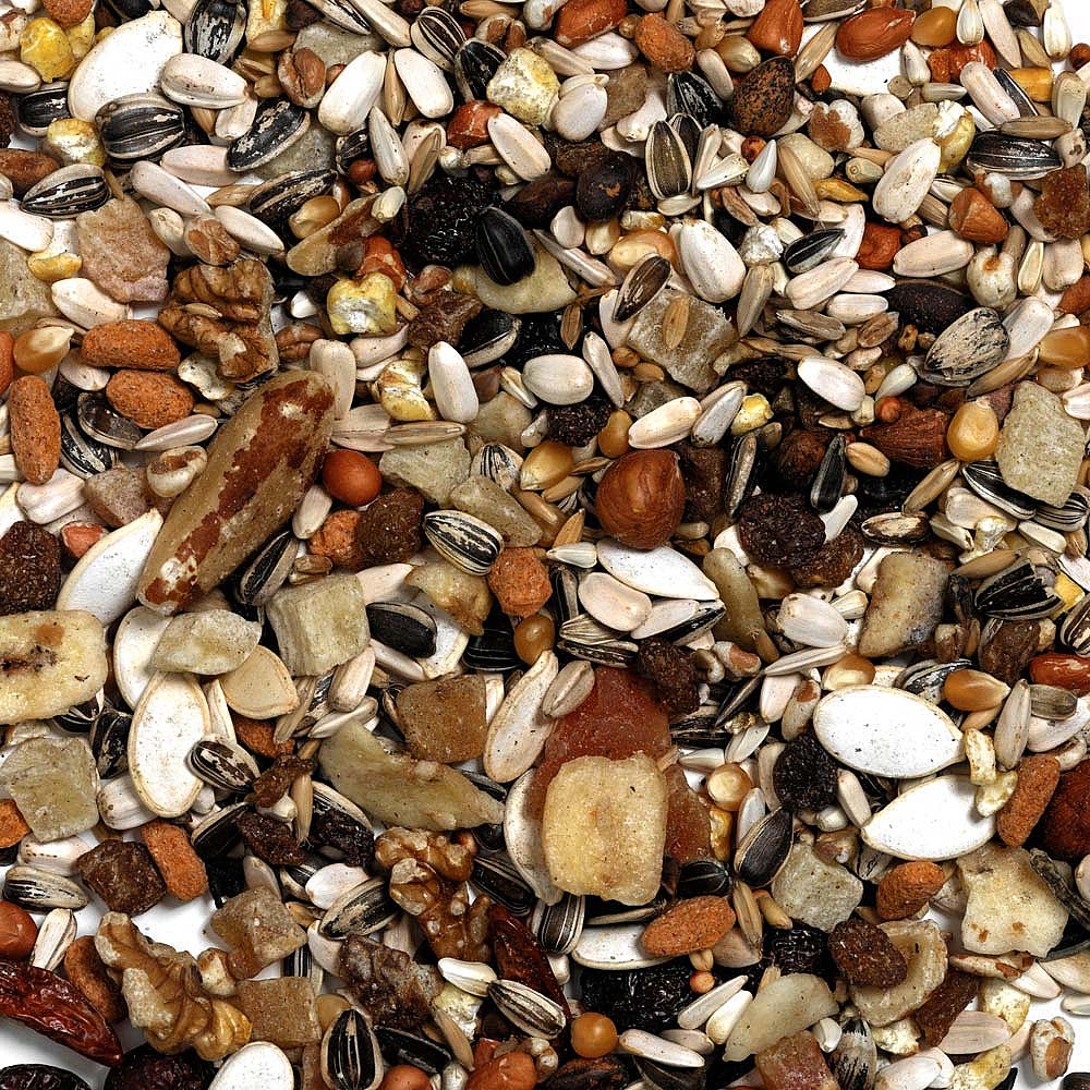 Seeds, Fruit (min 35% mis of Dried Banana, Raisins, Rose Hip, Papaya, Apricot, Pineapple) Grains, Nuts, Vegetables.