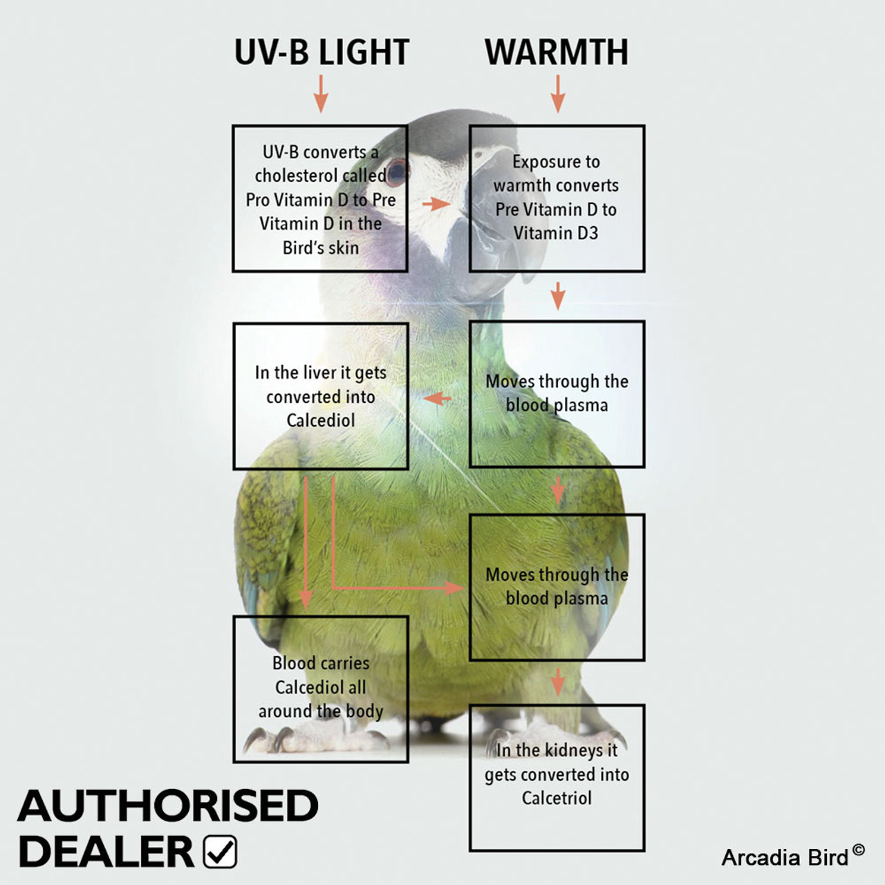 This Arcadia Bird replacement 8watt 2.4% UV-B specialist bird lamp will help to ensure fantastic colour vision in pet birds kept inside and allow them to make their own Vitamin D3 naturally.