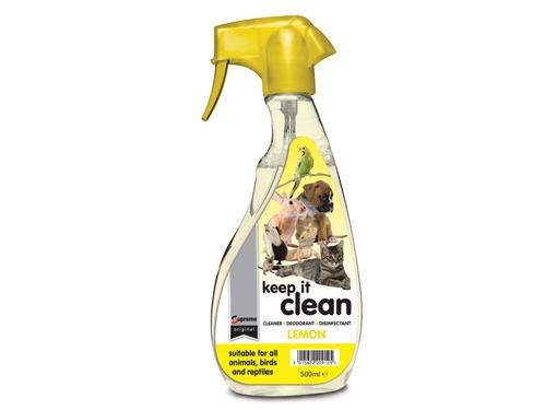 Keep It Clean is a cage and hutch cleaning spray that reduces pet odours, germs and bacteria (which can harm your pet), also reducing the risk of flystrike. Keep It Clean can also be sprayed on bedding and accessories, as well as inside the cage or hutch, ensuring that your pet’s home is clean and smells fresh at all times. Suitable for all animals. Lemon 500ml.